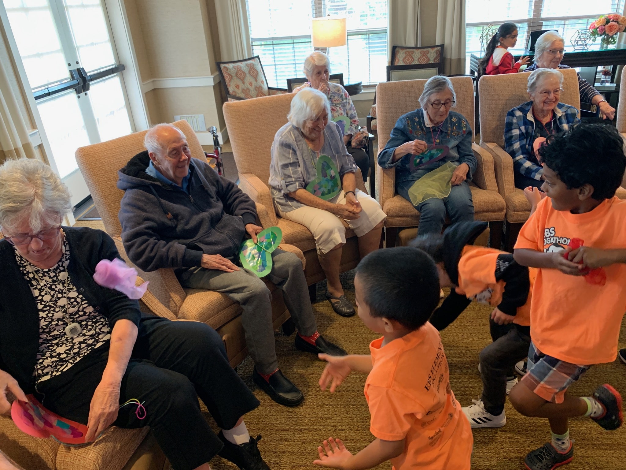 We practiced our conversation skills we had worked on by introducing ourselves and telling about our selves and then asking about our senior friends! We were able to play “Rock, Paper, Scissors,” and a little game of catch using scarves! Smiles were all around! At the end we were able to play our 2 recorded songs from our Mother’s Day in class and give them a little craft gift we had made! This was a memorable and loved time for everyone in the room!